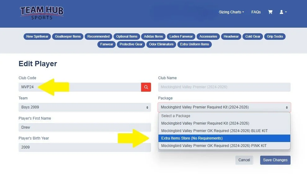 *Players who already have profiles in the team hub will need to edit their player to add in the MVP24 code and select the appropriate uniform kit from the drop-down box. See images below for how to edit your player.